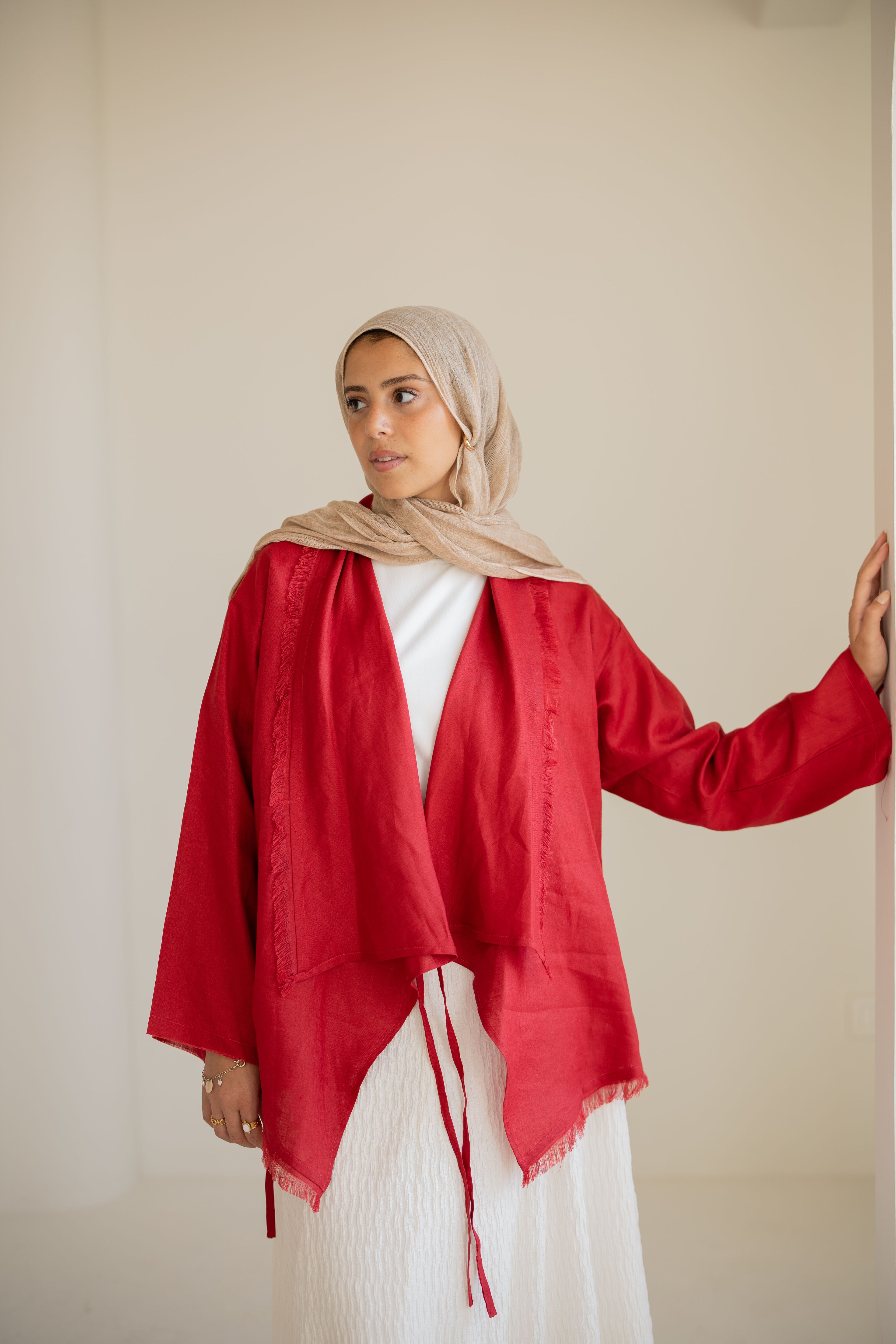 Fringes Pure Linen Cardigan In Red